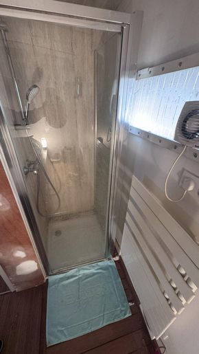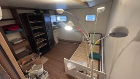 A staircase leads down to a large corridor serving three cabins, providing ample space for family and friends or the option to create a home office. The boat also includes a shower room with shower and WC, as well as a second WC on the upper level for added everyday comfort.