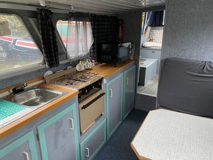 Entering the cabin, the galley is situated to your right. Well-equipped and thoughtfully designed, it offers generous storage for your groceries, pots, and pans, along with a grill, two-burner hob, sunken sink with drainer, and microwave. There’s also useful surface space for meal preparation.