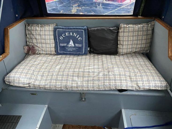 At the bow, a V-shaped seating area provides a cosy space to unwind — this can also be transformed into a sleeping area at night with a mattress or your own cushions, allowing you to make the space truly your own.