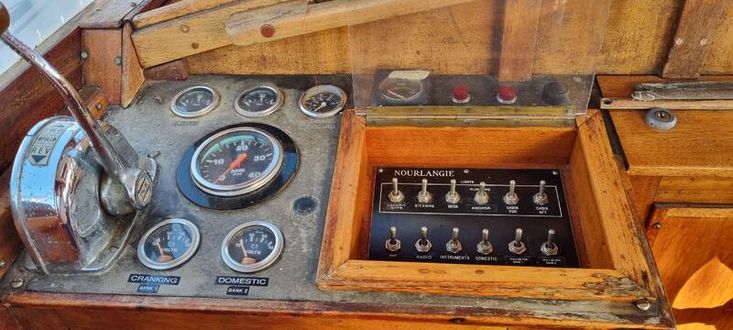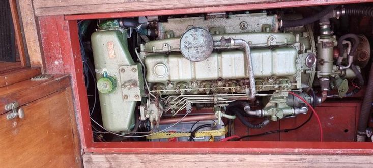 Engine 1973 perkins 62hp diesel with prm reduction, freshwater cooled 6 cylinders, flexible mounts. Morse engine controls. Electric starting. Alternator.80 gallon fuel capacity in GRP tank.