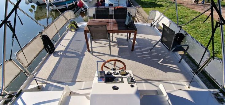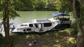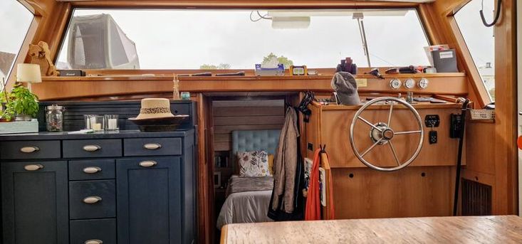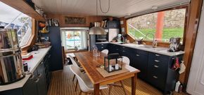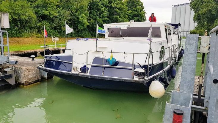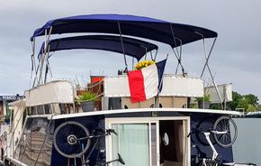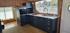 L'Escapade is a superb river vessel, unique in its configuration. Its current owners have made it their home for the past 10 years. Its large dimensions and proportions are a cross between a river boat and a houseboat. There is a single private cabin at the front with its own bathroom, while the rest of the space is taken up by the kitchen and the bright, glass-fronted lounge at the rear. A large bay window at the stern offers unique panoramic views. There is a second bathroom, and a comfortable sofa that converts into a king-size bed for guests. Technically, Escapade has everything you need for comfort both when sailing (2 thrusters, electric bimini top, etc.) and for life on board (central heating, very large tanks, large capacity for utilities, etc.). The last hull survey was in 2023. Antifouling and anode check in 2024. 2017-2018: kitchen conversion. Dry docking on 4 lifting legs via passages integrated into the construction. 9 mooring cleats in total, aluminium gangway. Double navigation station, very large deck, very comfortable flat sides, secure and well-sized stainless steel guardrails, low air draft, robust steel construction (6.5 and 4 mm, 24 t)...all additional qualities that make the Esacapade a superb vessel, ideal for all projects, a must-see.