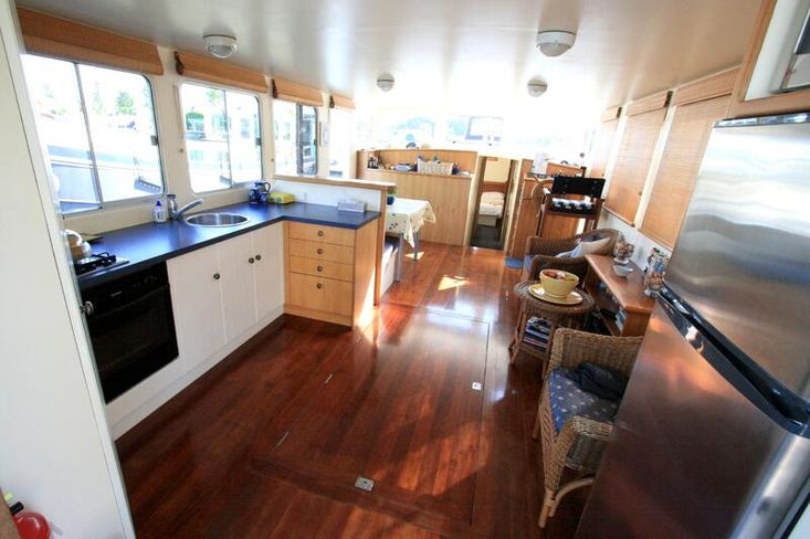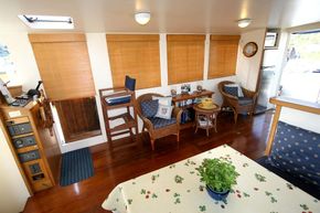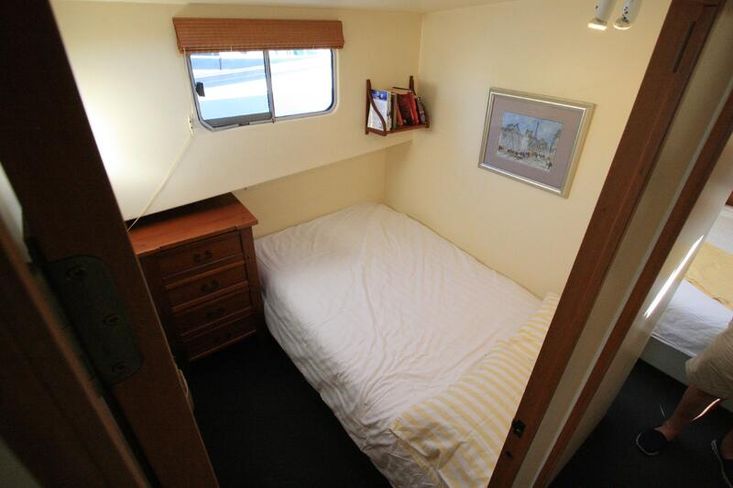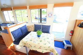 On the technical side, the barge is powered by a 130 hp John Deere diesel engine and equipped with a 9 hp Sidepower bow thruster, hydraulic steering, and an electric windlass. Generous tanks provide excellent autonomy: 2,600 L of fuel, 2,900 L of fresh water, and 60 L for black water.