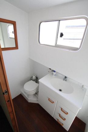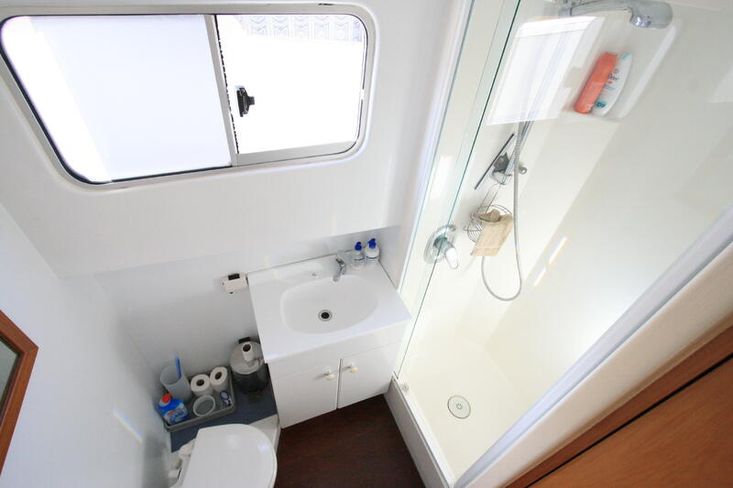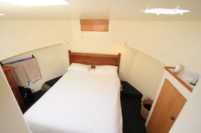 The barge features three cabins: two side cabins—one converted into a lounge and the other into an office—as well as a forward cabin with a large central double bed. In addition, two bathrooms, each equipped with a shower and electric toilet, enhance the onboard comfort.