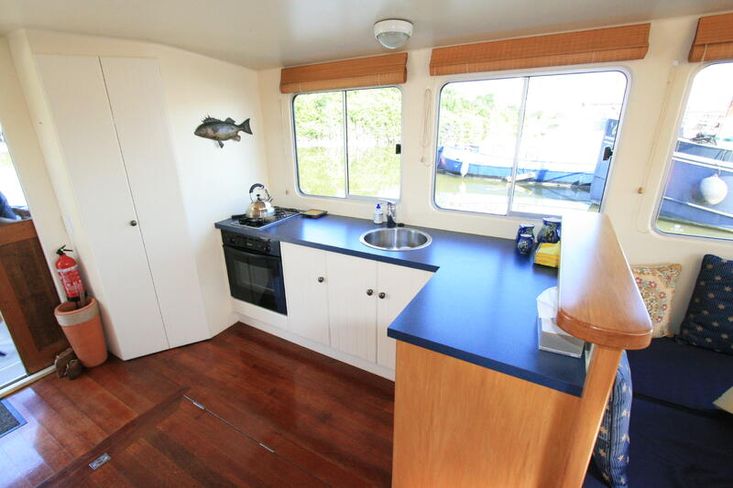 This bright and comfortable 16-meter barge, measuring 4.30 meters wide and built in 2000, is ideal for both river cruising and life on board. It offers a spacious and welcoming living area that includes a fully equipped kitchen (gas stove, 220V oven, refrigerator, freezer, and microwave), open to a dining area and a helm station.