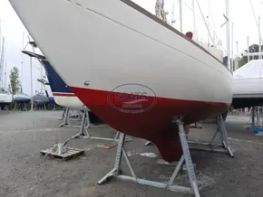 Voilier en polyester lourd avec pont sandwich Airex, quille profonde et safran suspendu, réputé pour sa solidité, son confort et ses performances au près.
