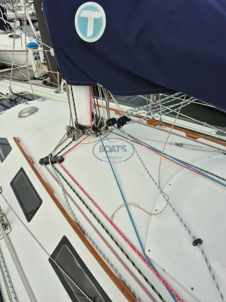 Cabine avant : couchette double. Carré : 4 couchettes simples + grande couchette sous cockpit. Mousses récentes, WC Jabsco révisé 2024.